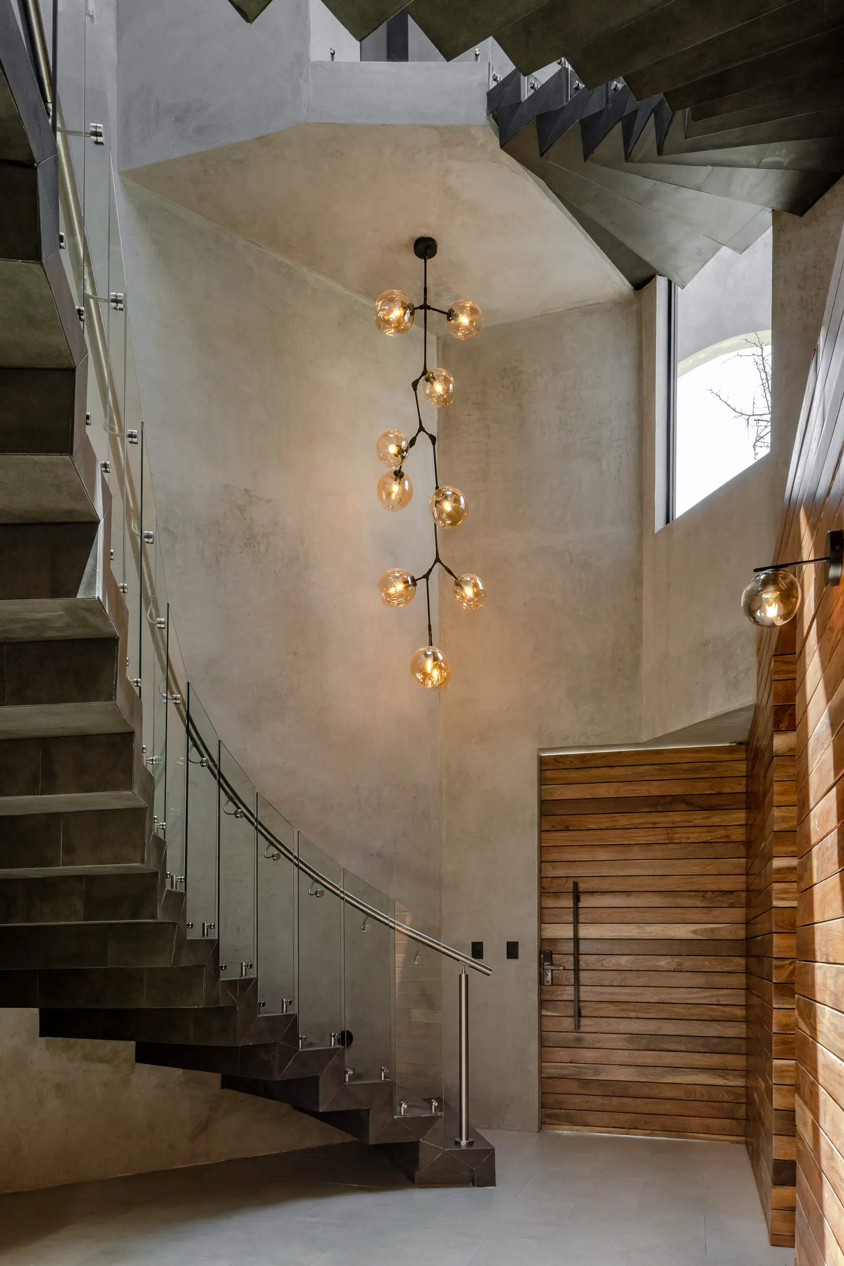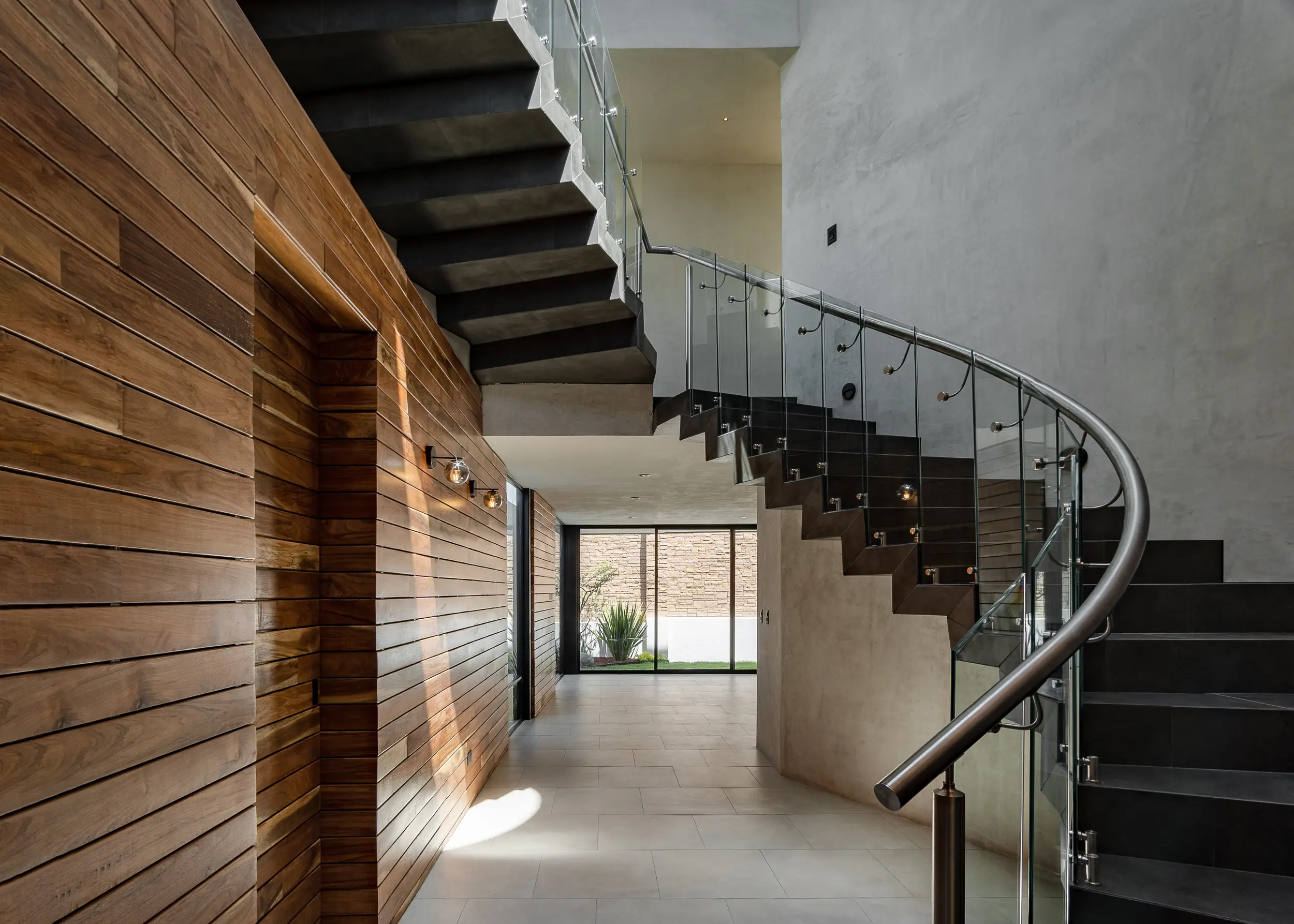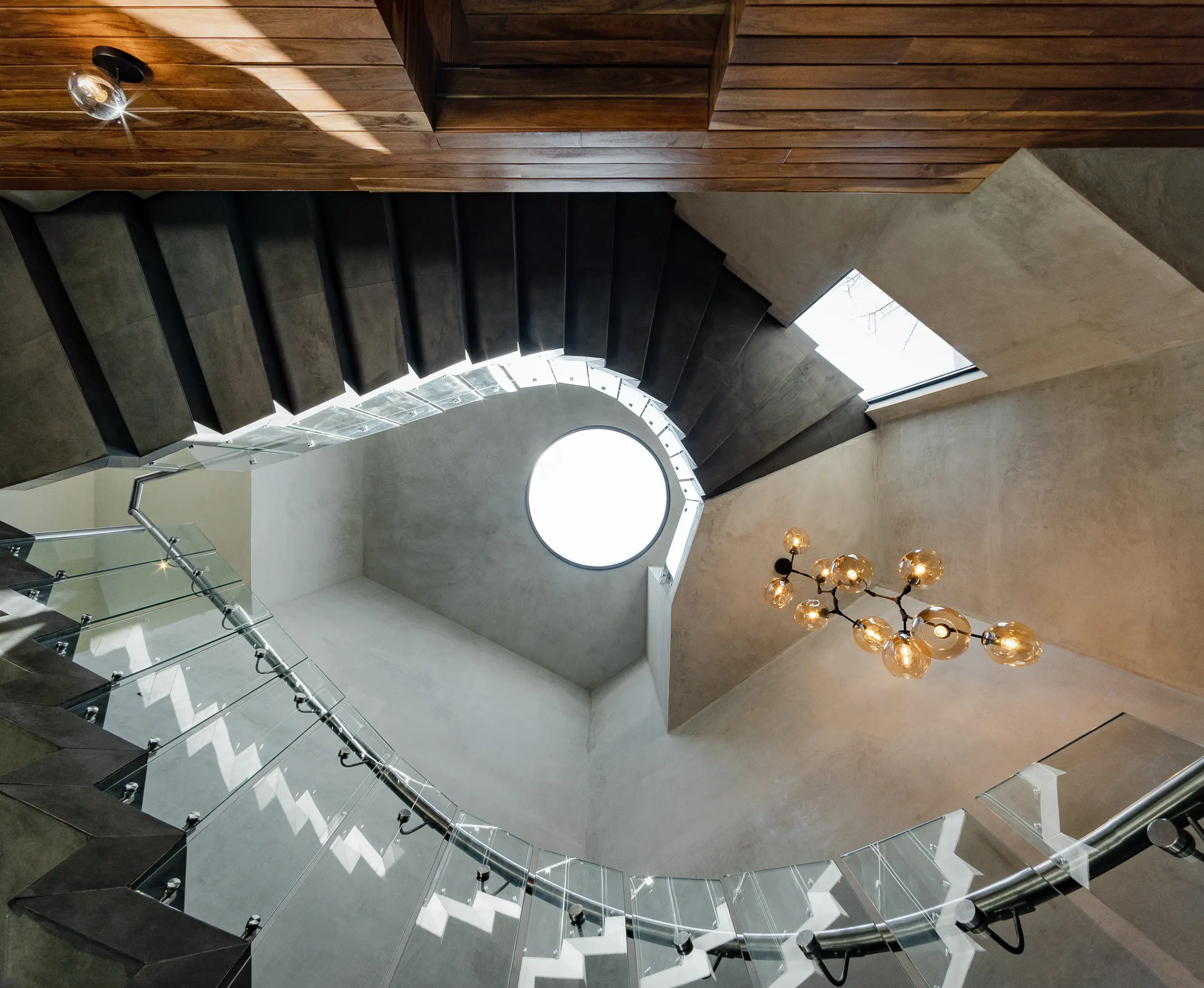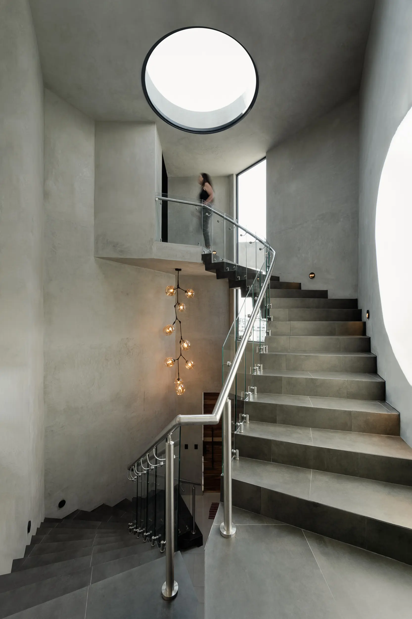 La escalera helicoidal de concreto, que gira bajo un óculo central, se establece como la columna vertebral del espacio y una experiencia arquitectónica en sí misma. Los interiores amplios y luminosos combinan madera, concreto pulido, vidrio y acero, generando un lenguaje sobrio y funcional que favorece la convivencia y la fluidez espacial.