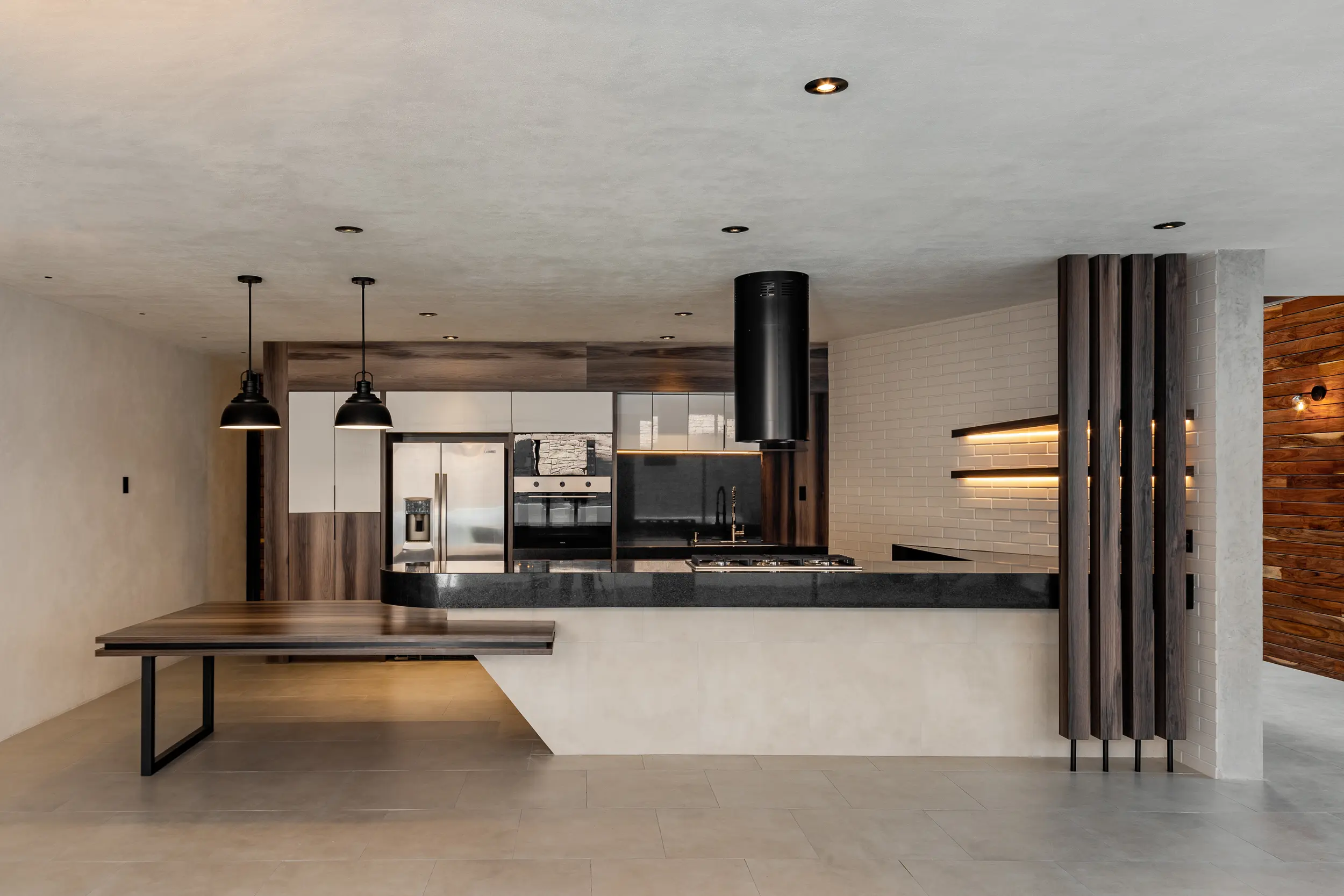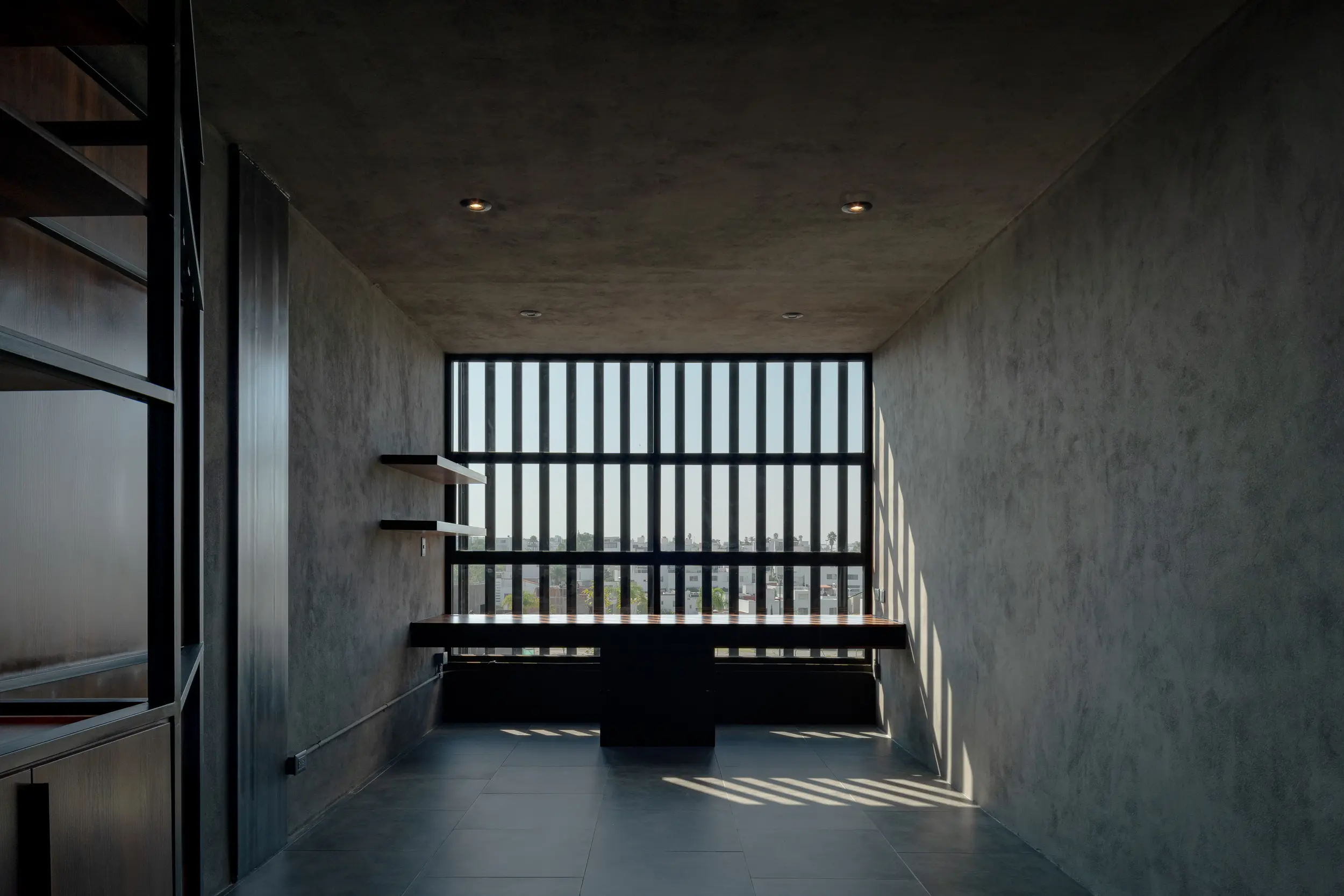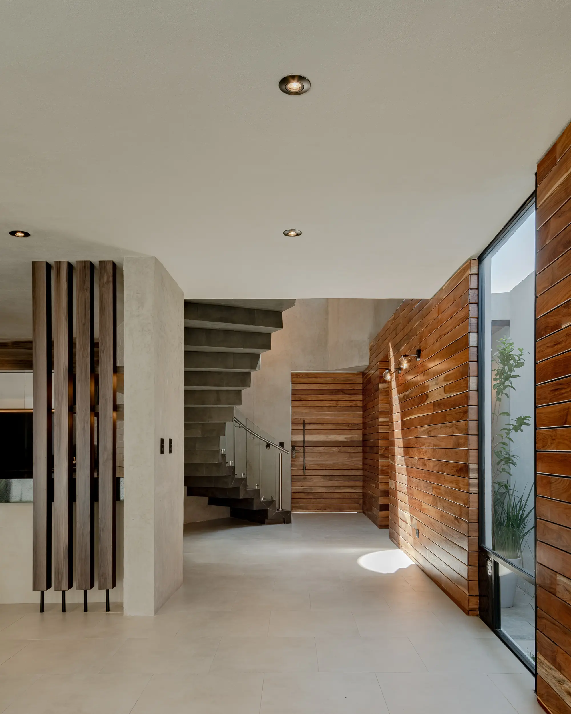 La escalera helicoidal de concreto, que gira bajo un óculo central, se establece como la columna vertebral del espacio y una experiencia arquitectónica en sí misma. Los interiores amplios y luminosos combinan madera, concreto pulido, vidrio y acero, generando un lenguaje sobrio y funcional que favorece la convivencia y la fluidez espacial.