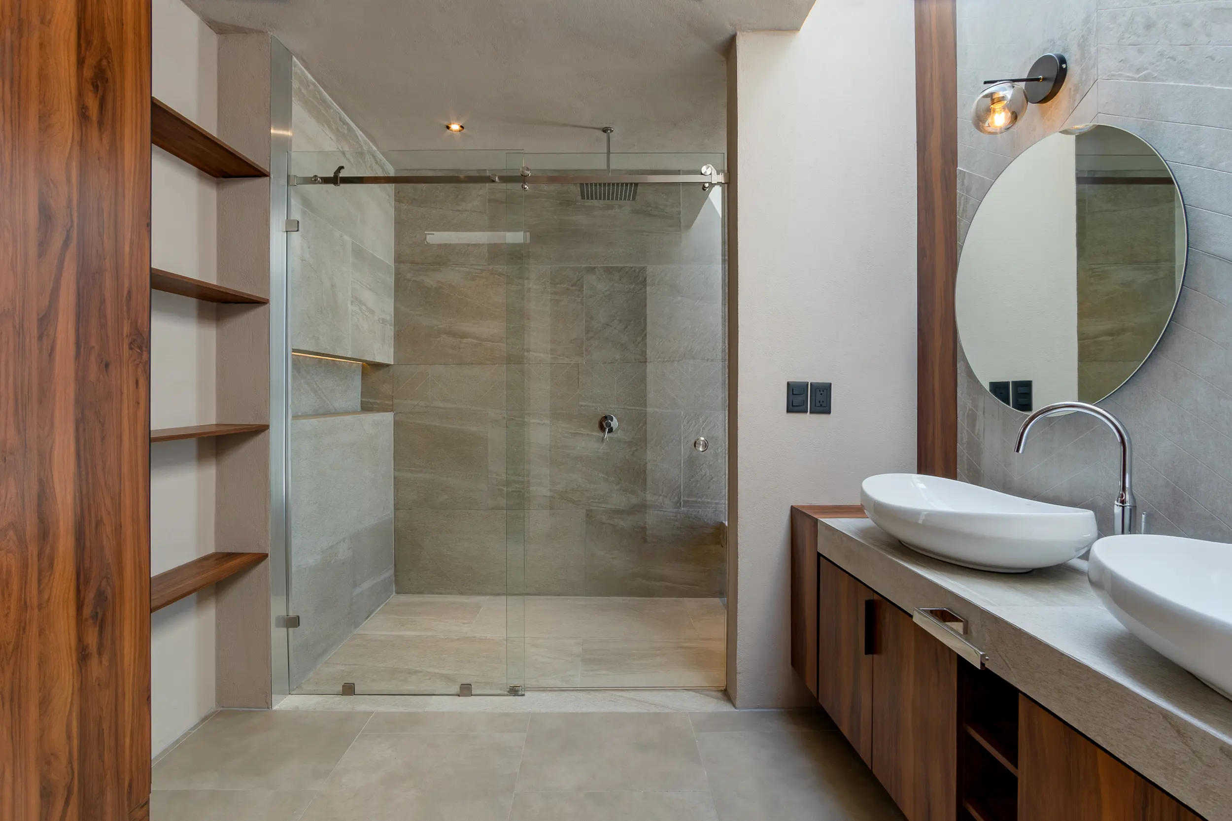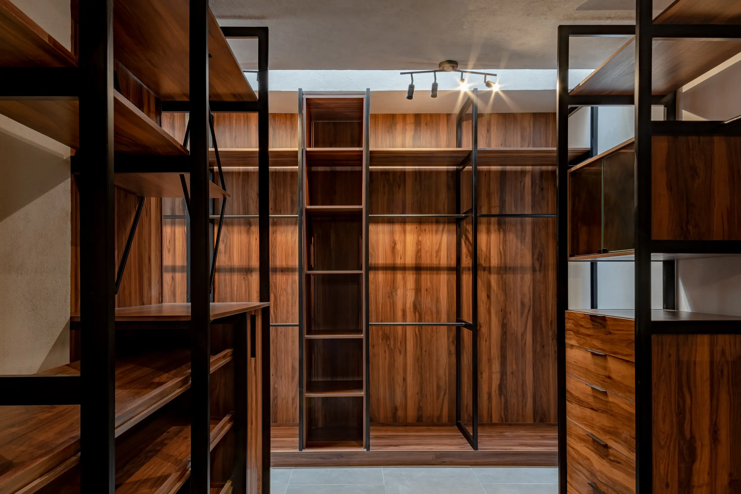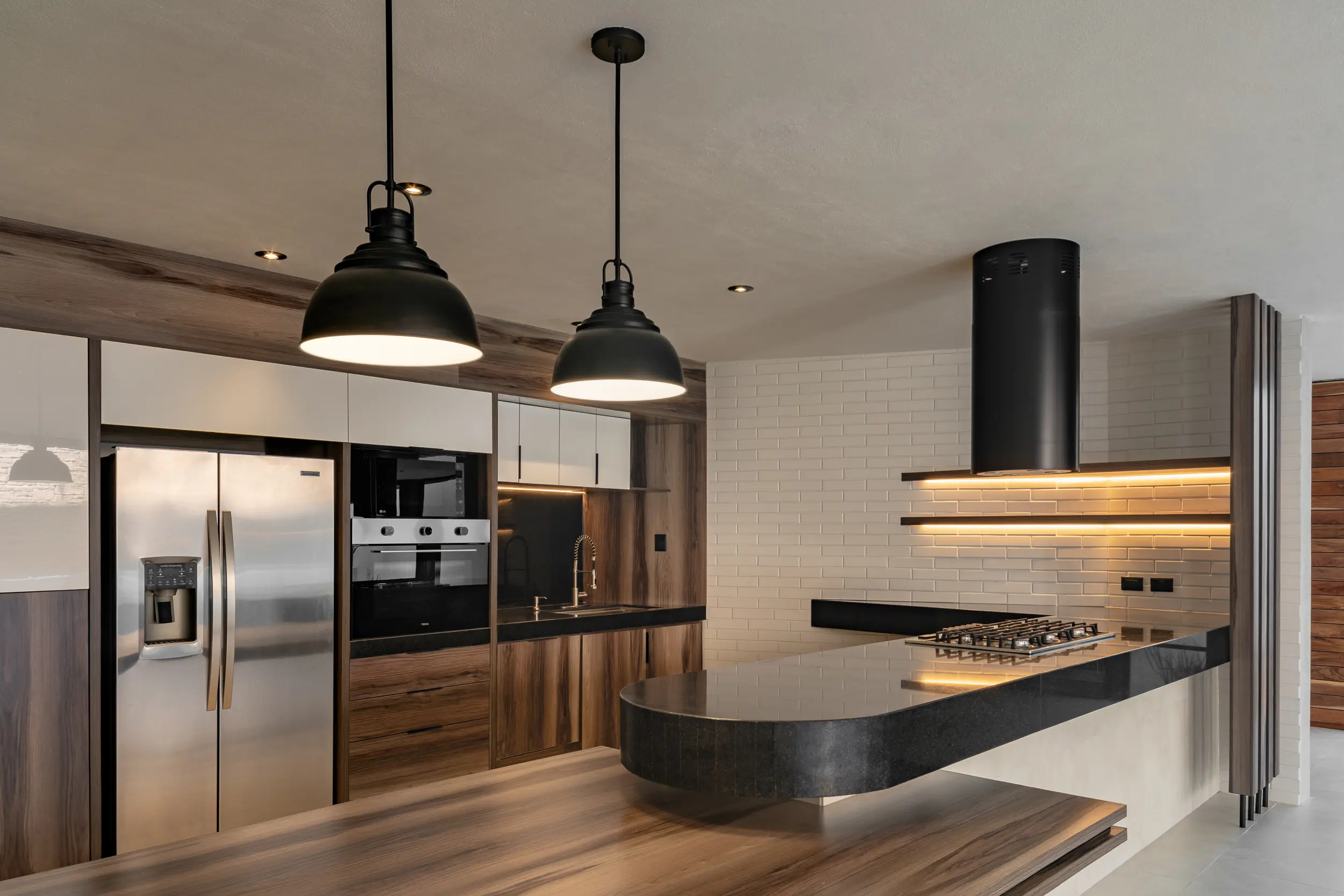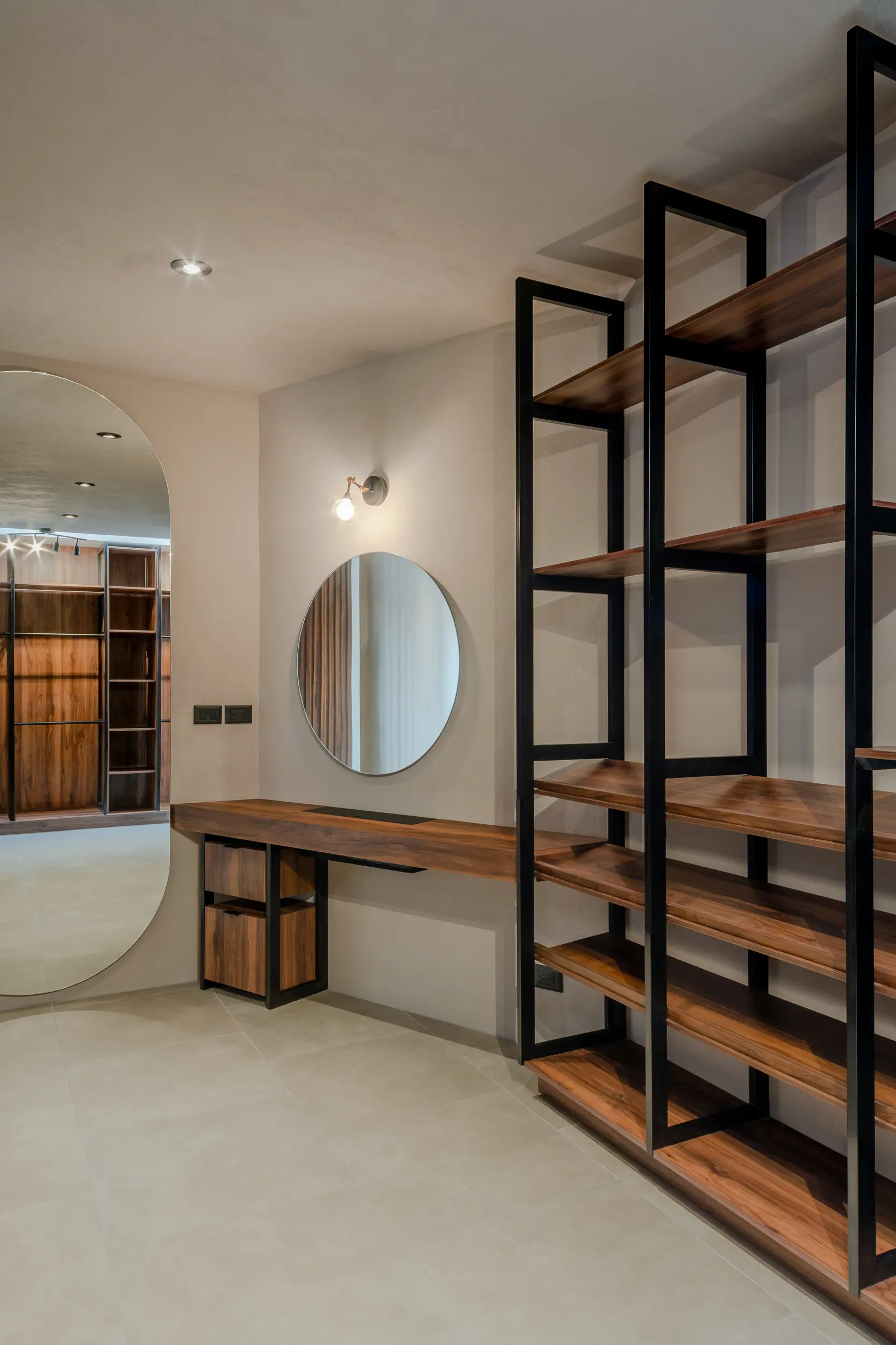 La escalera helicoidal de concreto, que gira bajo un óculo central, se establece como la columna vertebral del espacio y una experiencia arquitectónica en sí misma. Los interiores amplios y luminosos combinan madera, concreto pulido, vidrio y acero, generando un lenguaje sobrio y funcional que favorece la convivencia y la fluidez espacial.