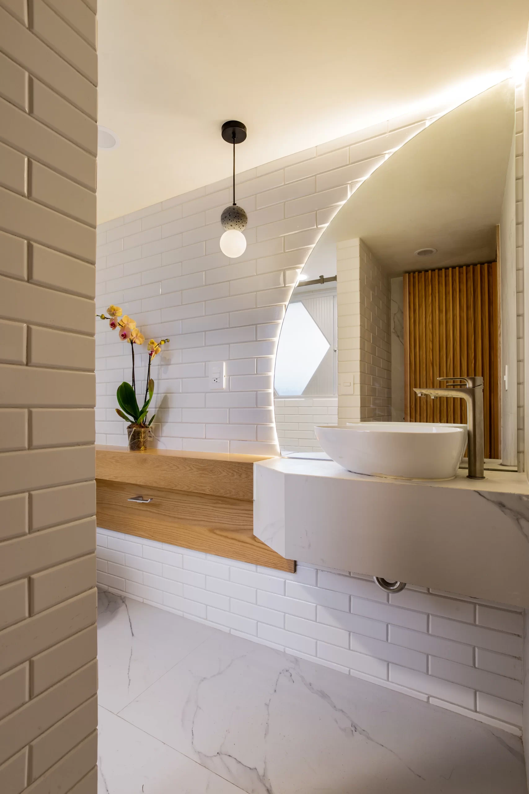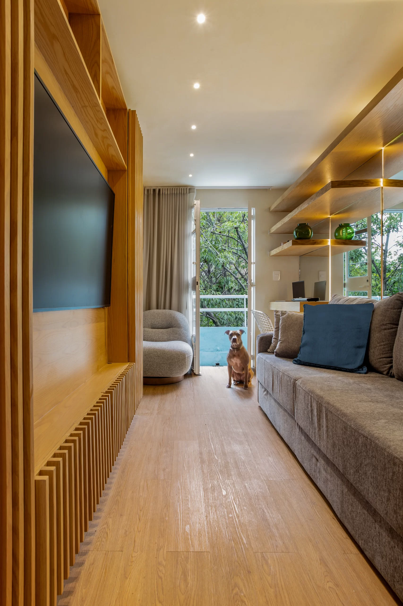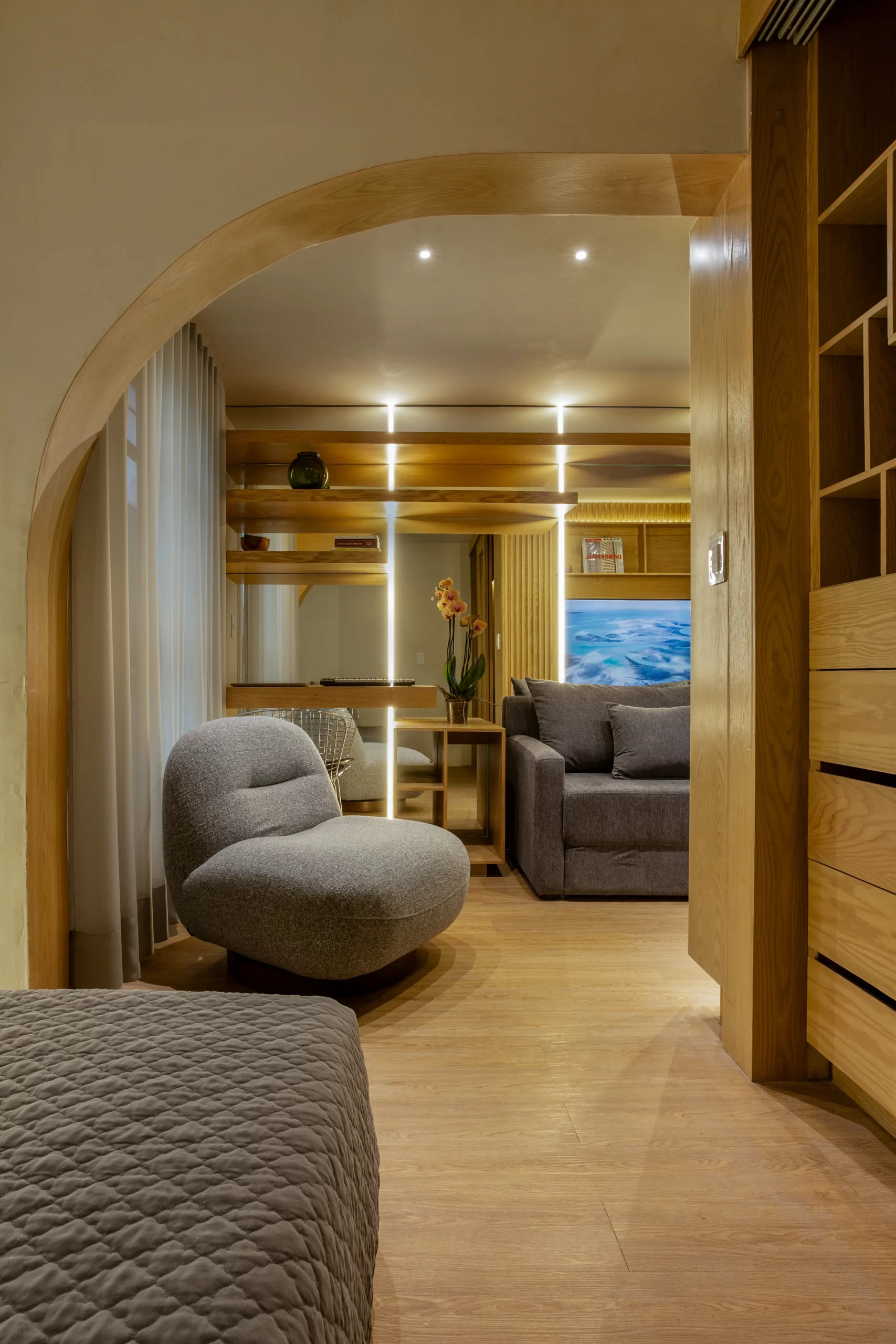 La materialidad juega un papel fundamental en la transformación del espacio. El uso de madera natural, acabados pétreos y elementos metálicos en tonos neutros genera una atmósfera contemporánea que equilibra calidez y sobriedad. Los elementos fijos —mobiliario, cancelería y carpinterías— funcionan como dispositivos arquitectónicos que articulan los espacios sin recurrir a divisiones rígidas.